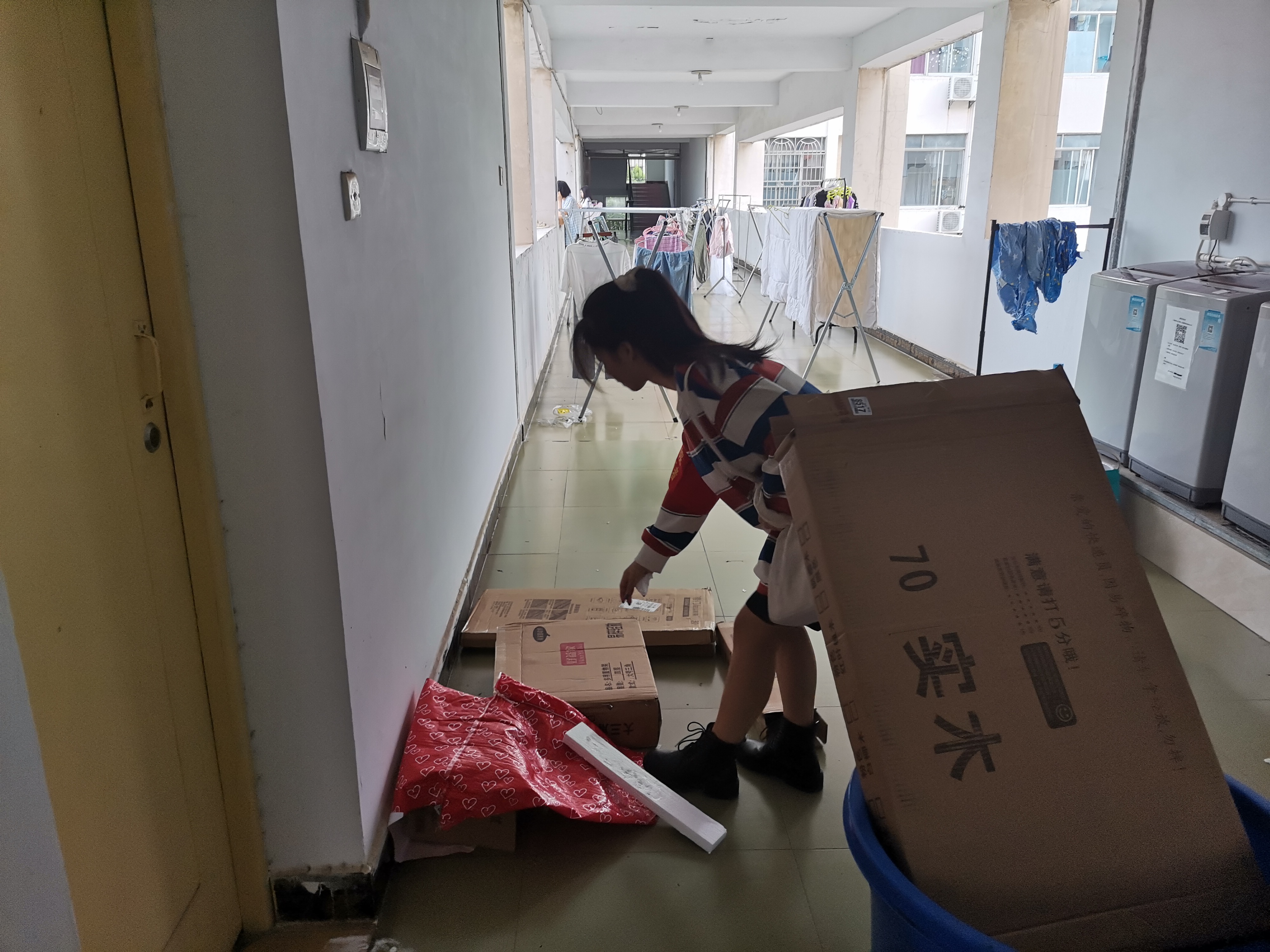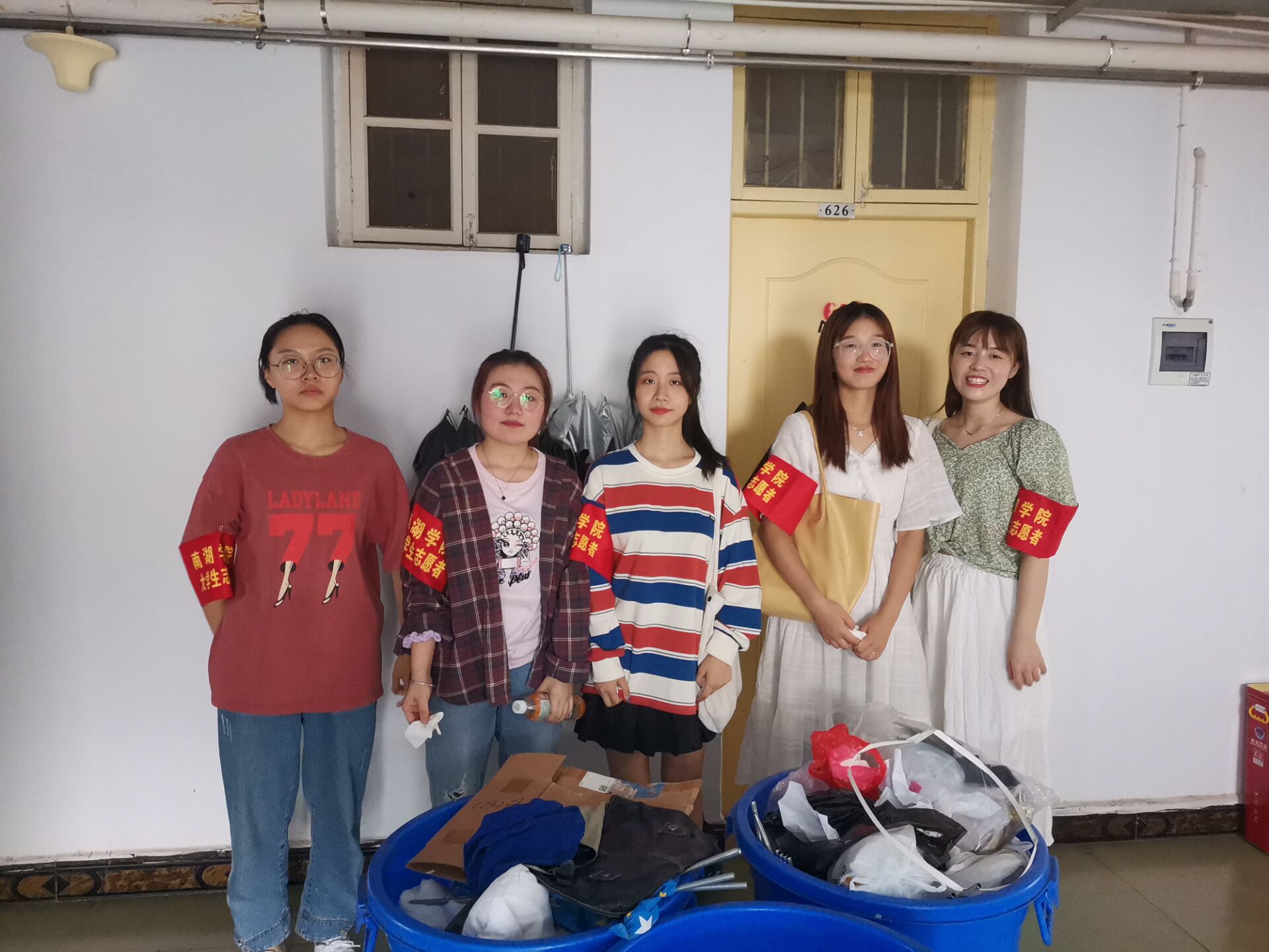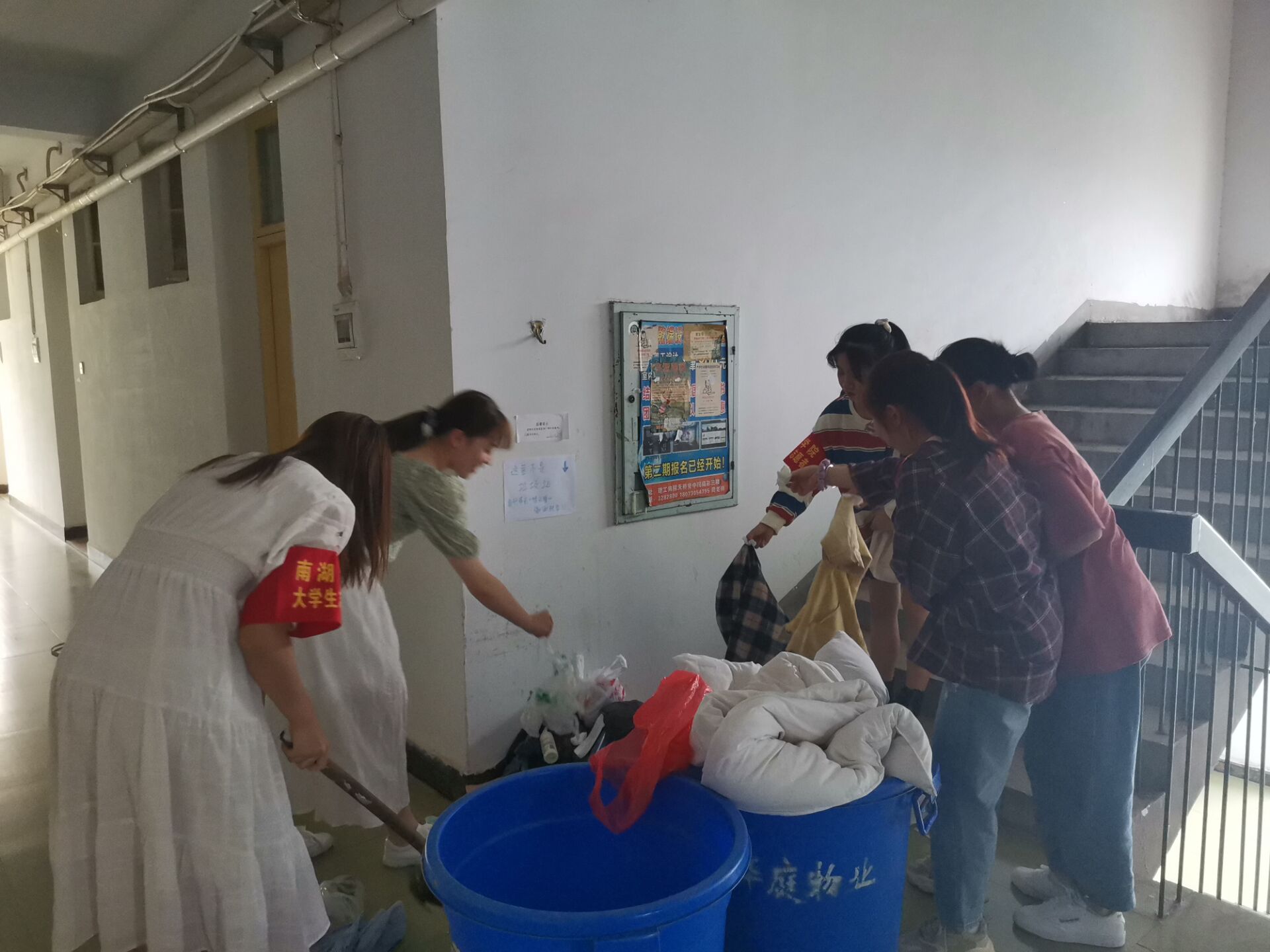 臂戴红袖章,手提垃圾桶,我系学生们前往各楼层检查卫生。针对发现的垃圾堆积楼道的现象,进行了集中清扫处理,志愿者们热情高涨、干劲十足,杂物一扫而空,楼道通畅整洁,环境清爽如初。