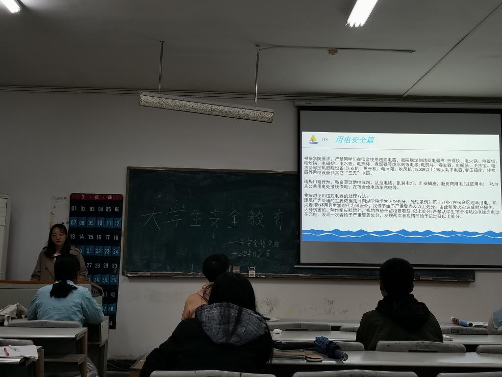 宣讲活动开始后,安信部全体干事分别在各班进行宣讲。本次宣讲主要分为交通安全篇、食品安全篇、用电安全篇与电信诈骗篇四个部分。