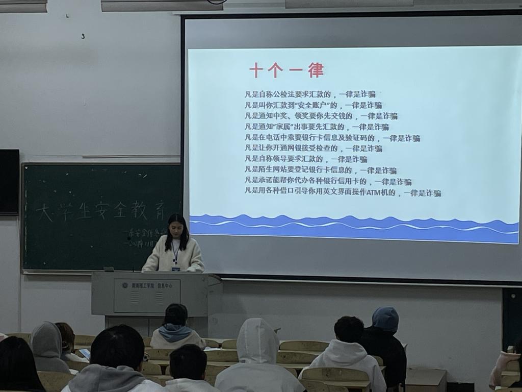 最后的电信诈骗篇也是本次安全教育宣讲活动的重点。主持人介绍了各种常见的网络诈骗手段并列举了相关案例,着重介绍了相对应的防骗措施。网络世界繁杂无比,提高同学们网络的安全意识、教导同学们有效应对各种诈骗方式是遨游网络时的有力庇护。
