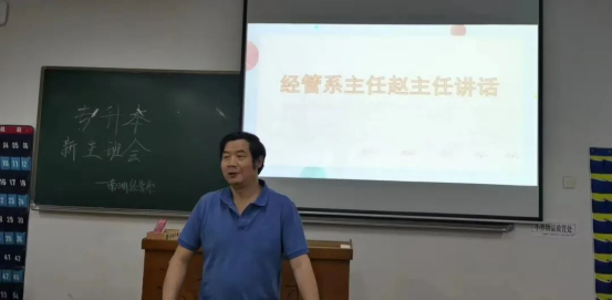 会上,经管系主任赵皇根讲话,赵主任对新生到南湖学院经管系求学表达祝贺,希望同学们能够顺利度过接下来的两年求学之路;感谢同学们选择了南湖学院经管系,也是对学校的旅游管理专业的认可;祝福同学们在学习生涯再创佳绩,提升自己、终身学习,将来拥有美好的生活和工作。