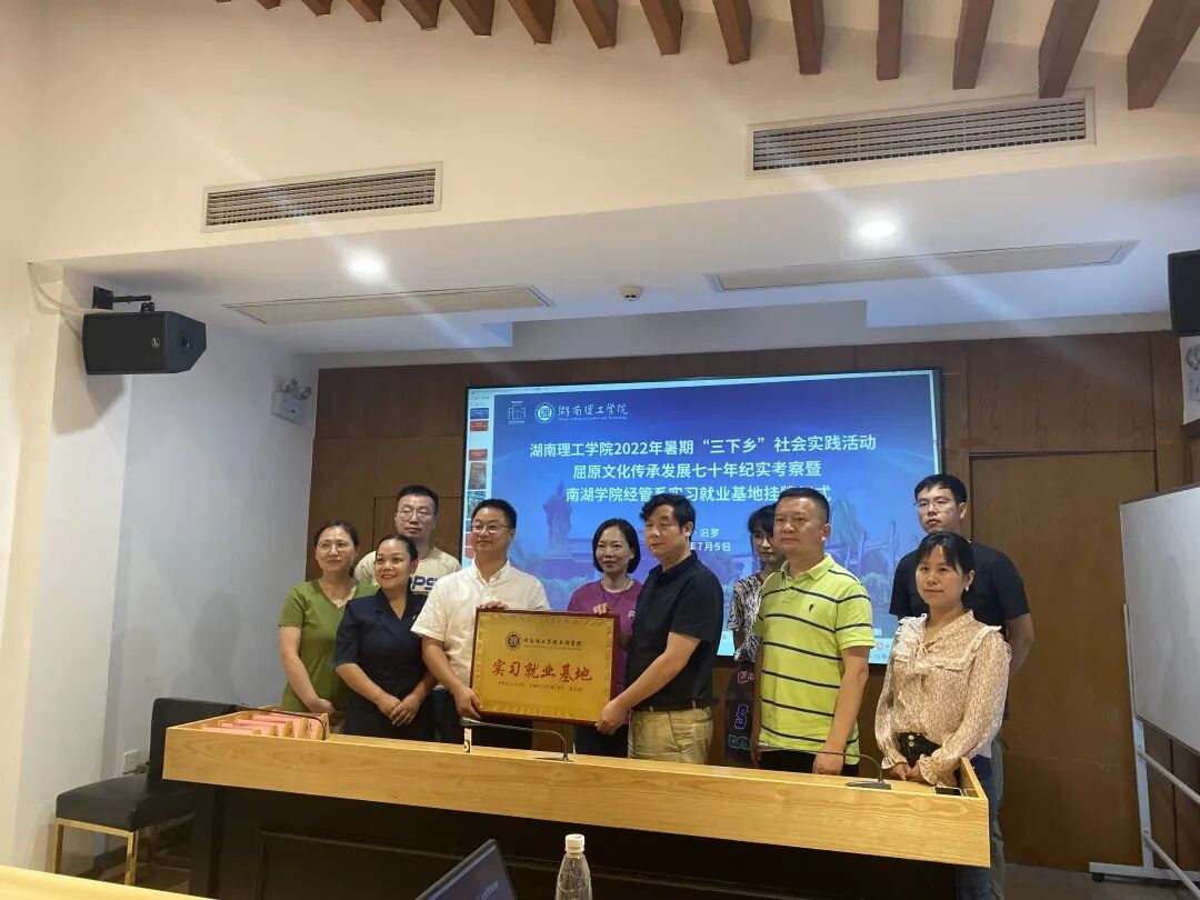 上午8:30,我系调研团队及在刘姣花老师的带领下与汨罗市领导举行了一场座谈会。会上,汨罗市屈子文化园管理事务中心书记李峰向大家介绍了屈子书院的过去历史、现状和未来;汨罗市文联副主席韩新卫向阐述了屈原题材中文学创作文艺创作以及文艺研究三个方面的成就;汨罗市文联主席甘征文介绍了以屈原文化为创作题材的文艺创作情况;汨罗市非遗传承人戴芸伊戴讲解了香囊的制作技艺。随后,南湖学院经管系与屈子文化园举行实习就业基地授牌仪式。会上,经管系主任赵皇根表示,希望通过与企业、行业合作建立校外实习就业基地,培养学生理论联系实践的能力;同时通过与屈子文化园的合作,探寻屈原文化与旅游融合发展的新思路、新路径,进一步保护传承和创新屈原文化,共同助力把屈子文化园建设成为文旅融合发展的示范区。最后,授牌仪式结束后与会所有领导老师合影留念。这将标志着湖南理工学院南湖学院经管系与屈子文化园文旅合作交流新的起点。