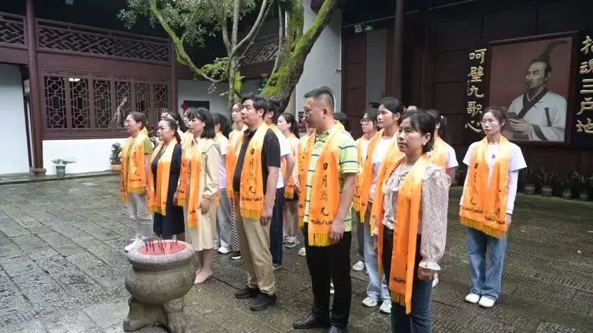 上午10:30,我系调研团队对屈子祠、屈子书院进行了参观考察,导游细致地解说屈子祠“汨罗江是屈原殉难的地方。汨罗江沿岸的人民很早以前就建起了纪念屈原的建筑。据晋代《拾遗记》载:‘楚人为之立祠,汉之犹存’,说明屈原死后不久,便修建了庙宇;到汉代已有了刻碑记事。唐代建三闾大夫屈原祠;五代时封屈原为昭灵侯,元代加封为忠洁清烈公,庙以封名称之。明清时代,屈原祠屡毁屡建。乾隆21年修葺后,人们将屈原祠从汨罗江边迁移到玉笥山上,即现在的屈子祠。屈子祠内有屈原故里遗址和罗子国墓地出土的楚文物。这些文物揭示了两千多年前屈原被放逐在南楚汨罗江一带的社会状况。同学们来到屈子祠瞻仰,无不被屈原那种忧国忧民、上下求索的精神所感动,受到一次爱国主义和历史唯物主义的教育。同学们对屈原相关故事产生了很大的兴趣,并在屈子祠下进行了祭拜屈原的仪式。在仪式过程中,带队老师们以及同学们都佩戴黄色领巾,严肃认真的聆听祭文并手捧香火祭拜。