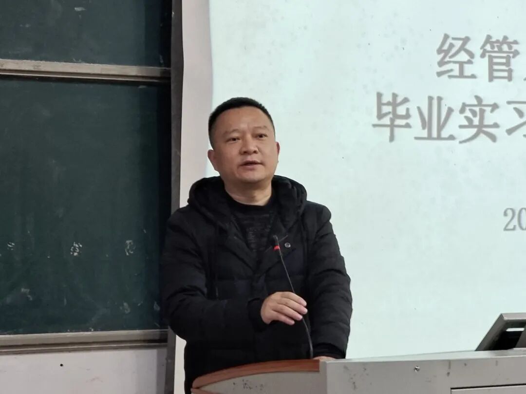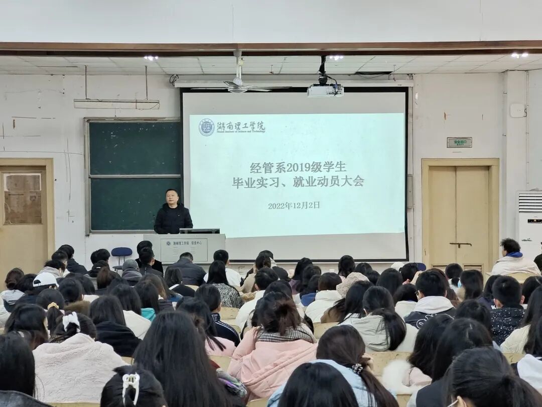 为了让2019级学生明确实习的目的和意义,引导学生做好实习和毕业季的相关工作,经管系于12月2日在东院文学楼2T1教室举行了2019级学生毕业实习、就业动员大会。长沙神州浩天信息技术服务有限公司执行董事宋穗、湖南维特智能物联公司总经理余海燕、经管系主任赵皇根、党总支书记刘姣花出席本次会议。会议由经管系党总支副书记李鹏主持,2019级全体学生参加。