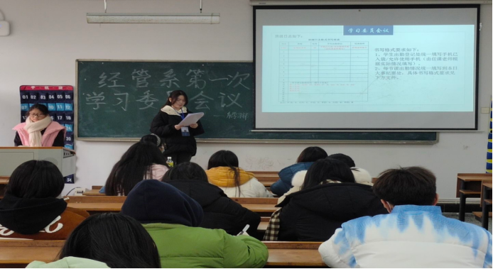为加强我系学风建设,增强学生自我管理能力。经管系于12月6日中午12:00在东院文学楼2311教室召开第一次学习委员会议。学习部指导老师胡家颖出席本次会议。此次会议由学习部干事史开芬主持,20、22级各班学习委员参加会议。