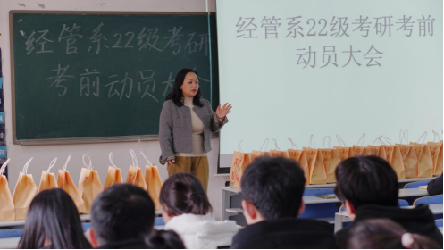 会上,经管系党总支书记刘姣花作动员讲话。她充分肯定了同学们在漫长备考周期中付出的艰辛与努力,表达了对大家的深切关怀与坚定支持。她强调,考研是成年后对人生重要的主动选择,鼓励同学们要全力以赴、不留遗憾。同时她对考研学生寄予殷切期望,鼓励考研学生在冲刺阶段坚定信心,信心比黄金还重要,充分发挥自己的优势和潜力,为实现自己的梦想而拼搏奋斗。她认为,在最后阶段,关键在于“复盘”与“稳定”,并暖心寄语同学们金榜题名,成功上岸。