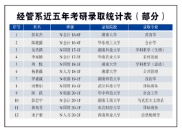 2024年经管系研究生录取22人,有数名毕业生被东北财大、华中师大等知名高校取。2025届29人录取攻读硕士研究生:2021届人力资专业李露露,2024年考取湖南农业大学博士研究生。